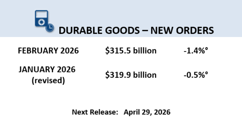 New orders for durable goods fell in February, according to a report released moments ago by the US Census Bureau. The decline dropped by $4.4 billion to $315.5 billion, marking the second consecutive month of decreases after a 0.5% drop in January. This was slightly below expectations of a 1.1% decline. Meanwhile, core orders, excluding transportation, rose by 0.8% in...